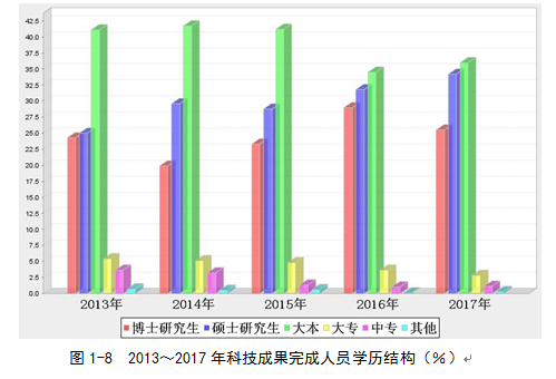 2017年,从学历构成看,科技成果完成人员主要集中在:本科,占比36.0%;硕士研究生,占比34.2%;博士研究生,占比25.5%。(见图1-8)。