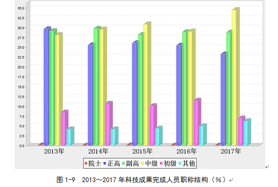 2017年,从职称构成看,主要集中在:中级,占比34.5%;副高,占比28.8%;正高,占比23.3%。(见图1-9)。