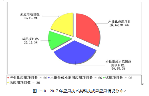 登记的应用技术类科技成果中,小批量或小范围应用项目数的科技成果保持着较高的比例,为69项,占35.2%;产业化应用项目数项目为62项,占31.6%;试用项目数项目为26项,占13.3%;未应用项目数为39项,占19.9%(见图1-10)。从总体上看,成果未应用的主要原因是管理问题和政策因素,分别占48.7%和20.5%;其次是市场问题、资金问题和技术问题,分别占17.9%、10.3%和2.6%。