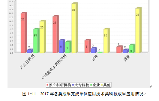 从稳定应用成果在各单位应用技术成果登记中所占比例来看,独立科研机构、大专院校、企业、其他单位分别为41.7%、13.3%、55.6%、21.3%,稳定应用成果比重均比较高。其次为小批量应用项目,分别为38.3%、53.3%、25.9%、33.0%。再次为试用项目,分别为13.3%、20.0%、0.0%、16.0%。(见图1-11)。
