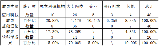 2018年,登记项目中应用技术类项目共48项,其中,独立科研机构和大专院校为10项和26项,分别占项目总数的20.83%和54.17%;企业为5项,医疗机构为3项,其他为4项,占项目总数的10.42%、6.25%、8.33%。应用技术类成果机构分布见图7。