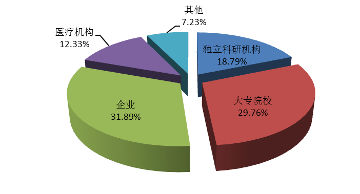 2018年,企业成为了全省科技成果主要完成单位,所占份额高于大专院校。2018年,按成果登记量排序依次是:企业375项,占31.9%,较上年提升4.7个百分点;大专院校350项,占29.8%,较上年下降13.1个百分点;科研机构221项,占18.8%,较上年提升2.3个百分点;医疗机构145项,占12.3%,较上年提升4.0个百分点;其他85项,占7.2%,较上年提升2.1个百分点。