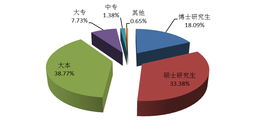 从完成人员文化程度分布来看,本科学历3848人次,占总人数的38.8%;硕士研究生3313人次,占33.4%;博士研究生1796人次,占18.1%;大专767人次,占7.7%;中专及其他共计202人次,占2.0%。