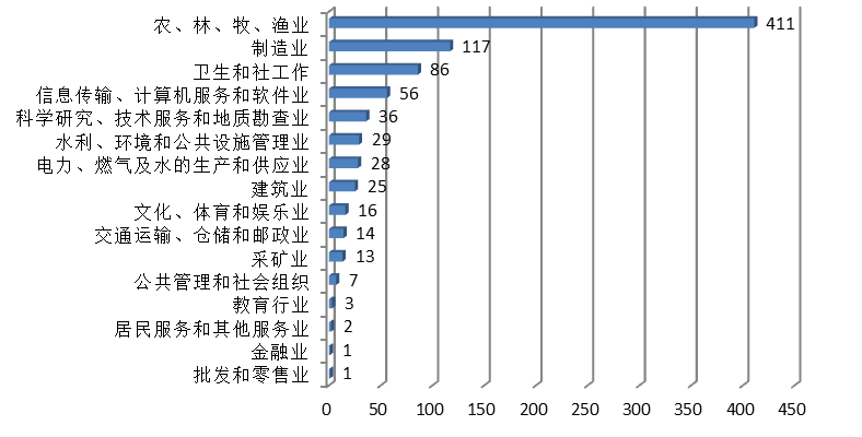 从成果应用的国民经济行业来看,在844项应用技术成果,广泛应用在15个行业中,其中,农林牧渔业、制造业及卫生和社会工作三个行业中科技成果应用的最多,科技成果数量依次为411项、117项和86项,这三个行业的科技成果占应用技术成果总量的72.7%。