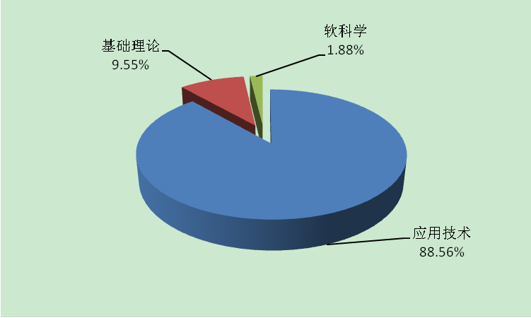 2018年度河南省共登记科技成果1434项,其中应用技术类成果1270项,占全部成果的88.56%;基础理论类成果137项,占全部成果的9.55%;软科学类成果27项,占全部成果的1.88%。