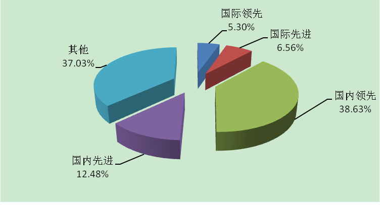 2018年度河南省登记的1434项科技成果中,达到国际领先水平的项目76项,占全部成果的5.30%,;达到国际先进水平的项目94项,占全部成果的6.56%;达到国内领先水平的项目554项,占全部成果的38.63%;达到国内先进水平的项目179项,占全部成果的12.48%,其他项目共531项,占全部成果的37.03%。