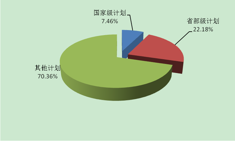 2018年度河南省登记的1434项成果中,来自国家级计划项目的有107项,占7.46%,来自省部级计划项目的318项,占22.18%,其它类项目1009项,占70.36%。