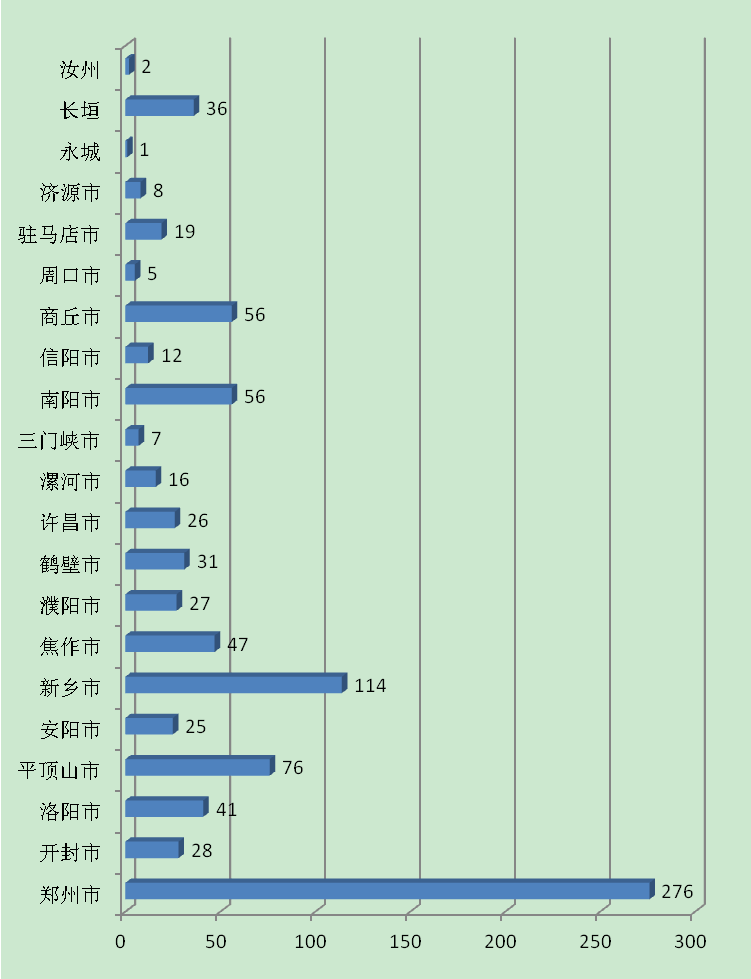 2018年省辖市推荐登记的862项成果中,郑州市276项,占30.36%;新乡市114项,占12.54%;洛阳市41项,占4.51%;安阳市25项,占2.75%;濮阳市27项,占2.97%;开封市28占3.08%;南阳市56项,占6.16%;焦作市47项,占5.17%;驻马店市19项,占2.09%;信阳市12项,占1.32%;平顶山市76项,占8.36%;许昌市26项,占2.86%;商丘市56项,占6.16%;鹤壁市31项,占3.41 %;济源市8项,占0.88%;漯河市16项,占1.76%;三门峡市7项,占0.77%;周口市5项,占0.55%;永城市1项,占0.11%;长垣县36项,占3.96%;汝州市2项,占0.22%。