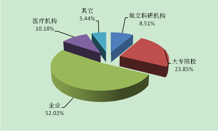 2018年度河南省登记的1434项成果中,独立科研机构完成的122项,占8.51%;大专院校完成的342项,占23.85%;企业完成的746项,占52.02%;医疗机构完成的146项,占10.18%;其他性质单位完成的78项,占5.44%。