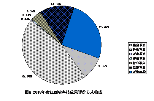 2018年度江西省登记的成果评价方式以验收为主,机构评价、结题为辅,鉴定及其他评价方式并存。登记成果中验收项目319项,占登记成果总数的45.90%,比上年上升10.63个百分点;机构评价项目177项,占25.47%,结题项目100项,占14.39%;鉴定、评审、评估、行业准入等其他评价方式项目99项,占14.24%(见图4)。