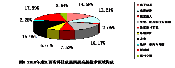 2018年度江西省登记的569项应用技术成果中,有439项属高新技术领域,占登记的科技成果总数的63.17%。其中,电子信息64项,占所登记的高新技术领域成果总量的14.58%;先进制造58项,占13.21%;航空航天9项,占2.05%;现代交通16项,占3.64%;生物医药和医疗器械71项,占16.17%;新材料79项,占17.99%;新能源与节能33项,占7.52%;环境保护29项,占6.61%;地球、空间与海洋10项,占2.28%;现代农业70项,占15.95%。生物医药领域在全省高新技术领域中所占比例最高,其次新材料和农业也都占有较大比例( 见图8)。