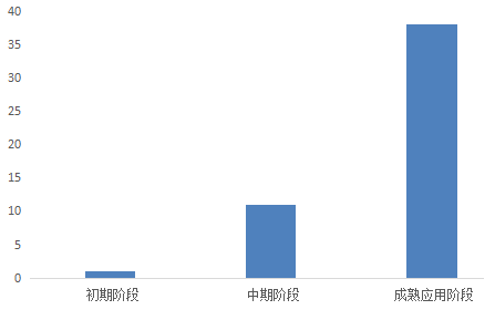 应用成果中处于初期阶段1项、中期11项和成熟38项,占比分别为5.0%、22.0%和76.0%。