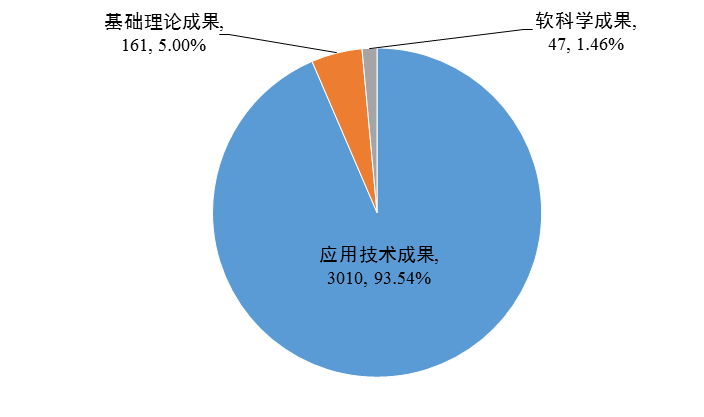 2018年陕西省共登记科技成果3218项。其中,应用技术成果3010项,占登记成果总数的93.54%;基础理论成果161项,占5.00%;软科学成果47项,占1.46%(见图1)。