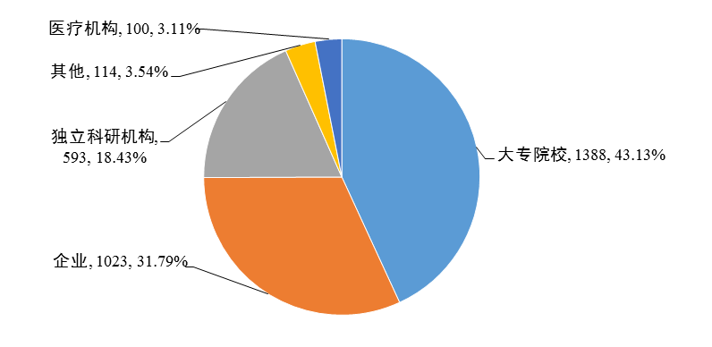 2018年陕西省登记的科技成果中,大专院校完成1388项,企业1023项,独立科研机构593项,医疗机构100项,其他类型单位114项。大专院校和企业是成果的主要完成单位,二者成果数量之和为2411项,占成果总量的74.92%(图7)。