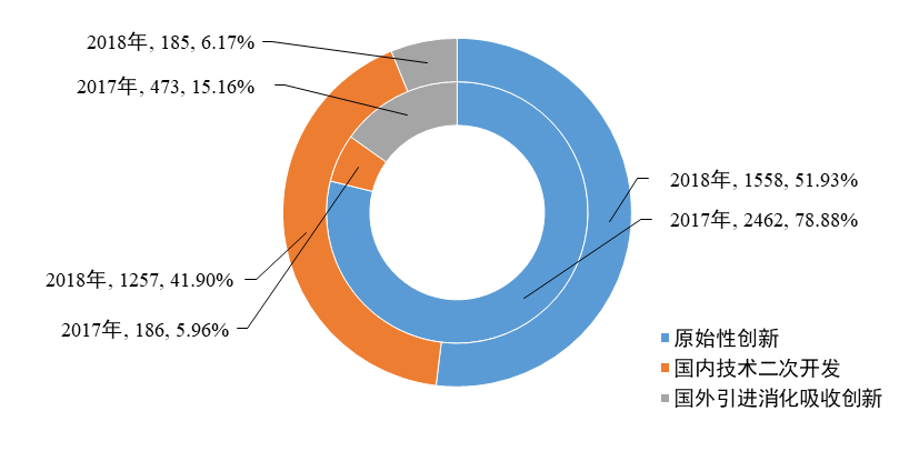2018年陕西省登记的应用技术成果呈现出以原始性创新、国内技术二次开发为主的特点。其中,原始性创新成果1558项,占应用技术成果总量的51.93%;国内技术二次开发成果1257项,较2017年增长了575.81%;国外引进消化吸收创新成果185项(见图8)。