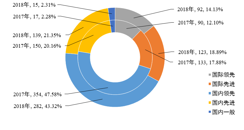 在已进行评价的651项成果中,有497项成果达到国内领先及以上水平,占已评价成果总数的76.34%,与2017年的77.56%基本持平。其中,达到国际领先水平的有92项,占总数的14.13%;达到国际先进水平的有123项,占18.89%;达到国内领先水平的有282项,占43.32%(见图9)。