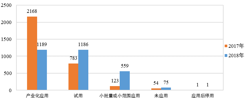 2018年陕西省登记的应用技术成果应用状态以产业化应用和试用为主。其中,产业化应用项目1189项;试用项目1186项,相较于2017的123项增长了864.23%;小批量或小范围应用项目559项;未应用项目75项;应用后停用项目1项。(见图10)。