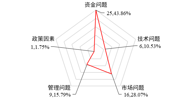 进一步地,对75项未应用项目的影响因素进行统计分析:成果未应用的原因以资金问题和市场问题为主,同时受政策、管理及技术等多种因素综合影响(见图11)。