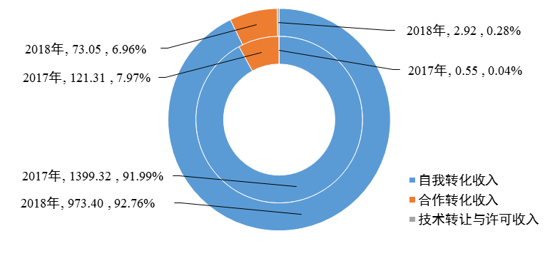 2018年陕西省登记的科技成果,实现经济效益1049.37亿元。自我转化总收入973.40亿元;合作转化收入73.05亿元,其中技术入股股权折价1.38亿元;技术转让与许可收入2.92亿元,其中知识产权技术转让收入1015万元。特别地,技术转让与许可收入迅速增长,较2017年的0.55亿元增长了2.37亿元(见图12)。