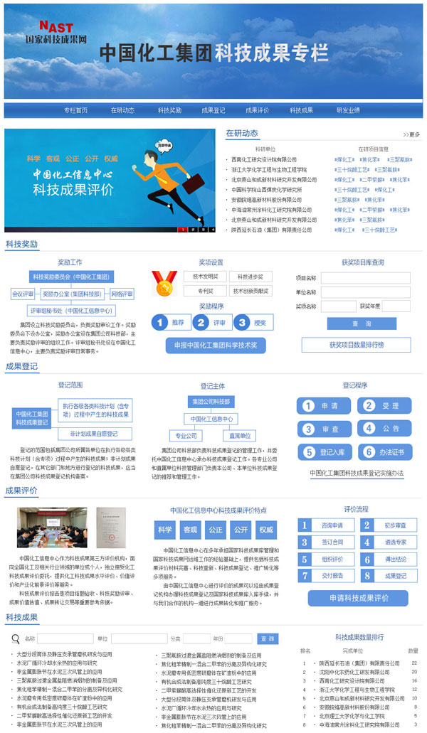 近日,由国家科技成果网、中国化工集团公司联合策划的“中国化工集团科技成果专栏”正式上线。专栏栏目包括:在研动态(展示中国化工集团公司承担国家科技计划项目情况)、科技奖励(介绍中国化工集团公司科技奖励工作情况)、成果登记(介绍中国化工集团科技成果登记工作情况)、成果评价(介绍中国化工集团科技成果评价业务情况)、科技成果(查询中国化工集团科技成果项目)、研发业绩(展示中国化工集团企业获奖项目和科技成果登记情况)。