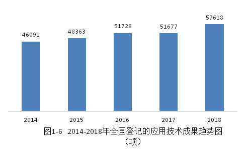 2018年全国登记的应用技术成果总量比上年有所增长。2018年全国共登记应用技术成果57618项,比上年增长11.50%,占全国登记成果总数的87.67%。
