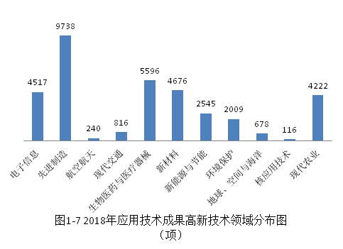 2018年登记的应用技术成果中,高新技术领域科技成果达到35153项,占应用技术成果总数的61.01%。高新技术领域成果主要分布在先进制造,生物医药与医疗器械,新材料,电子信息,现代农业等高新技术领域,这五个领域的应用技术成果达到28749项,占高新技术领域科技成果总数的81.78%(见图1-7)。