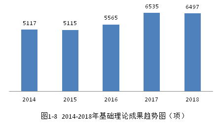 从近五年的情况来看,全国登记的基础理论成果总量基本呈现平稳增长状态,从2014年的5117项到2018年6497项,四年间增长26.97%。