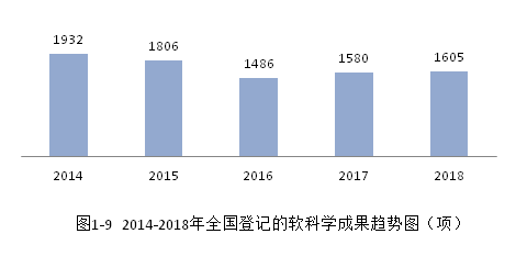 从近五年的情况来看,2014-2016年登记的软科学科技成果总量呈现缓慢下降趋势, 2017、2018年有所回升(见图1-9)。