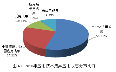 在2018年大专院校和独立科研机构完成的应用技术成果中,产业化应用的成果7089项。获得经济效益的成果为2786项,占大专院校和独立科研机构完成的应用技术成果的17.29%。已转化项目数 1707项,占大专院校和独立科研机构完成的应用技术成果的10.60%。