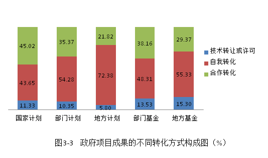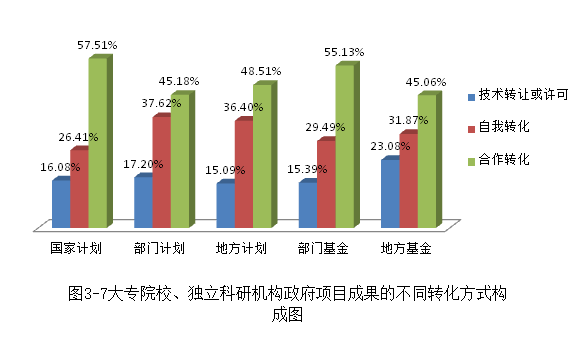 由大专院校及独立科研机构完成的各类政府项目科技成果转化的最主要方式是合作转化。在各种不同课题来源的政府项目成果中,合作转化所占比例都接近或超过50%。其次是自我转化,在各类政府项目中所占比例都在30%左右。技术转让与许可方式在大专院校和独立科研机构完成的各类政府项目成果中所占比例较低,这一比例在15%-24%之间(见图3-7)。