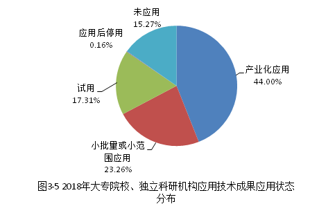 2018年全国登记的应用技术成果中,由大专院校及独立科研机构完成的成果共计16110项。其中产业化应用的成果数为7089项,占大专院校及独立科研机构完成的应用技术成果的44.00%,这一比例低于全部应用技术成果中产业化应用成果数的占比(54.46%)。小批量或小范围应用的成果数、试用成果数分别占大专院校及独立科研机构的全部应用技术成果的23.26%及17.31%。未应用成果数2460项,所占比例为15.27%。另有0.16%的成果(25项)应用后停用(见图3-5)。