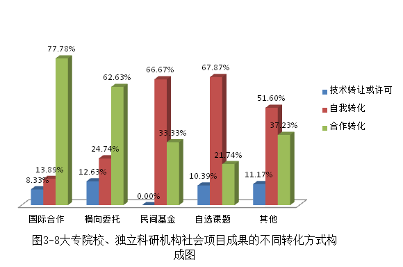 统计由大专院校及独立科研机构完成的各类社会项目成果转化的情况,发现也以自我转化和合作转化为主,以技术转让或许可方式转化的比例较低。合作转化是国际合作、横向委托项目成果最主要的转化方式,77.78%的国际合作项目成果及62.63%的横向委托项目成果通过合作转化方式进行转化。而民间基金、自选课题项目成果主要以自我转化方式进行转化,自我转化的成果比例各占这两类成果的约三分之二(见图3-8)。