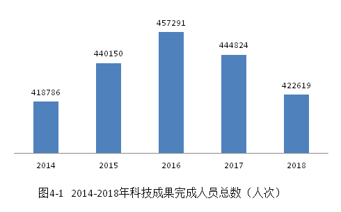 2018年登记的科技成果涉及到的完成人员共422619人次,比上年下降4.99%。