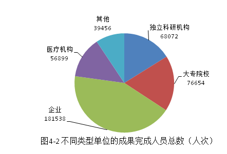 从单位属性看,2018年科技成果完成人中,企业科技人员为181538人次,占全部人次的42.96%;大专院校研究人员为76654人次,占18.14%;独立科研机构和医疗机构成果完成人员分别为68072人次和56899人次,分别占16.11%和13.46%(见图4-2)。企业科技人员是科学技术研究开发的主体。