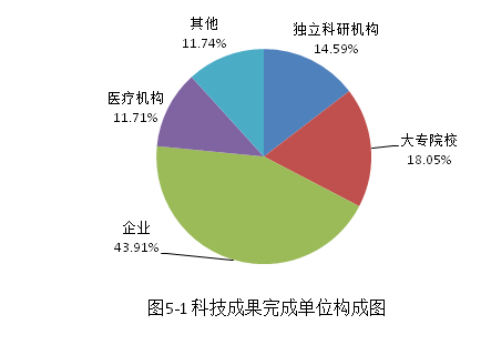 从2014-2018年登记的科技成果的情况来看,科技成果完成单位类型的构成情况变化不大,企业一直是科技成果的主要完成单位,在全部完成单位中的比例占四成多(见表5-1)。