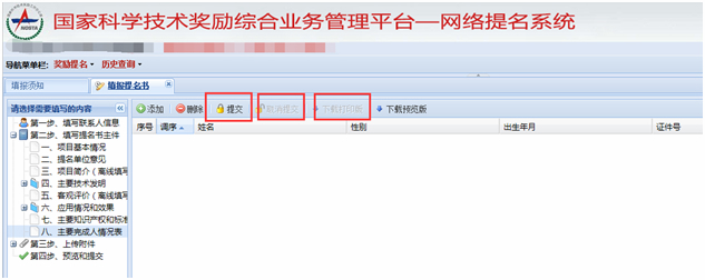答:为便于完成人、完成单位签名盖章,系统在“主要完成人情况表”“主要完成单位情况表”页面提供了单独提交的功能,在该页面点击“提交”按钮后,即可下载打印完成人、完成单位情况表(正式版)。需要注意的是,从此处下载打印的表格没有页码,须在最后装订时手工加注。在提名材料全部提交前,仍可在本页面点击“取消提交”按钮,以继续修改相应信息。