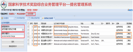 答:提名单位、填报人可利用系统自带的查重功能,在历史查询栏目,查询论文专利的使用情况,建议使用关键字查询。