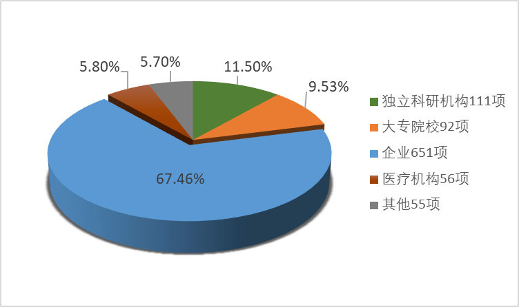 2019年登记的科技成果第一完成单位按属性归为五大类,各类项数、所占比例为:独立科研机构111项,占本年度成果第一完成单位的11.5%;大专院校92项,占本年度成果第一完成单位的9.53%;企业 651项,占本年度成果第一完成单位的67.46%;医疗机构56项,占本年度成果第一完成单位的 5.8%;其他55项,占本年度成果第一完成单位的5.7% 。