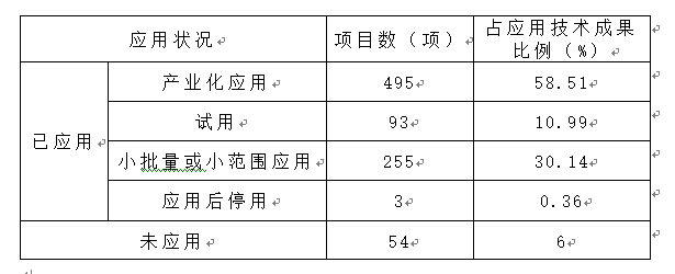 在已应用的成果中,产业化应用的495项,占本年度应用技术类成果的58.51%;试用的93项,占10.99%;小批量或小范围应用的255项,占30.14%;应用后停用的3项。
