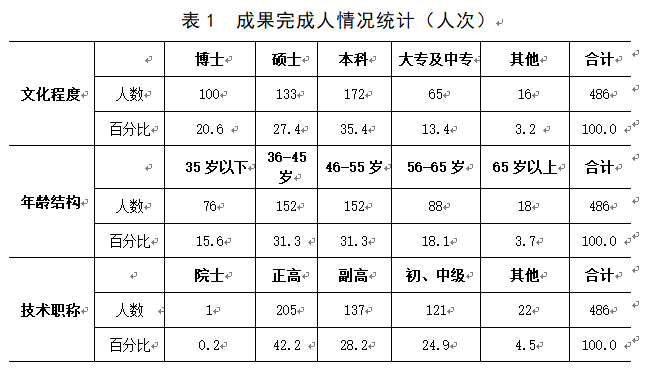 从年龄结构来看,今年成果完成人员分布较均衡,主要集中在45岁以下(含45岁)这个年龄段人数居多,为228人,占人员总数的47%;其次是46-55岁,分别为152人,占人员总数的31.2%;56-65岁和65岁以上两个年龄段人员较少,共106人,仅占人员总数的21.8%。