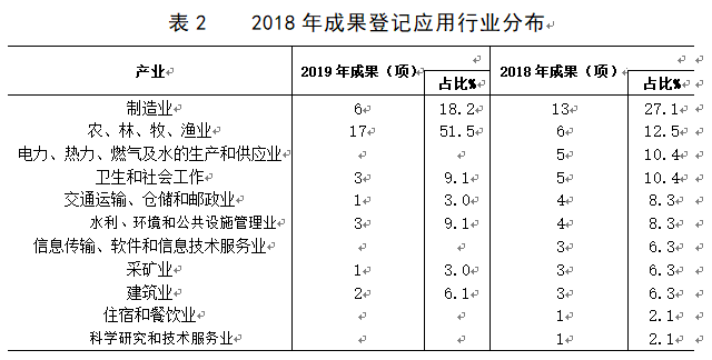2019年,由国务院有关部门科技成果管理机构登记的科技成果共有33项,均为应用技术成果奖项。