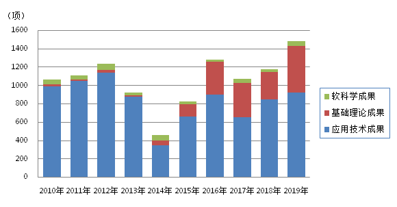 2019年应用技术成果922项,占62.3%,较上年增长9.2%;基础理论研究成果504项,占34.1%,较上年增长69.7%;软科学成果53项,占3.6%,较上年增长51.4%。
