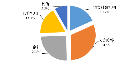 2019年,从完成单位的属性划分来看,大专院校466项,占31.5%,较上年提升1.7个百分点;企业367项,占24.8%,较上年下降7.1个百分点;科研机构269项,占18.2%,较上年下降0.6个百分点;医疗机构256项,占17.3%,较上年提升5.0个百分点;其他121项,占8.2%,较上年提升1个百分点。