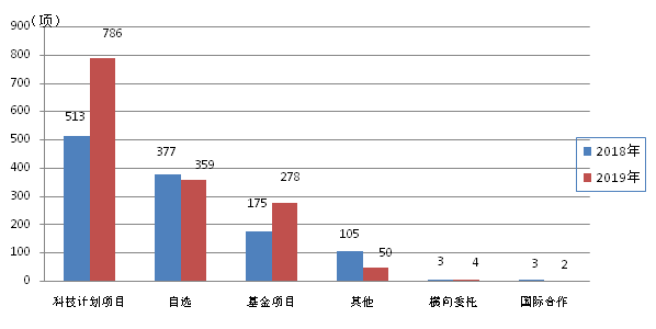 2019年,全省登记的科技成果以各类科技计划项目为主,政府资金起主导作用,其中来源于各类科技计划项目的成果786项,较上年增长53.2%,占登记成果总数的53.1%;自选项目359项,较上年减少4.8%,占24.3%;基金项目278项,较上年增长58.9%,占18.8%;横向委托4项,较上年增加1项,占0.3%;国际合作2项,较上年减少1项,占0.1%;其他项目50项,较上年减少52.4%,占3.4%。