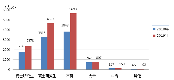 从完成人员文化程度分布来看,本科学历5693人次,占总人数的41.2%;硕士研究生4693人次,占34.0%;博士研究生2378人次,占17.2%;大专807人次,占5.8%;中专及其他共计251人次,占1.8%。从增幅来看,各学历人员均有不同程度的增长,其中本科、硕士研究生和博士研究生增幅显著,分别较上年增长47.9%、41.7%和32.4%。