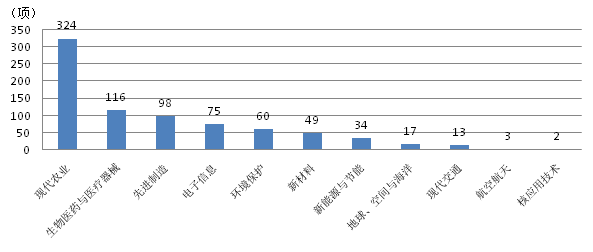 统计数据显示,在922项应用技术成果中,有791项属于高新技术领域,占到应用技术成果八成以上。我省科技成果共涉及11大类高新技术领域,其中现代农业、生物医药与医疗器械、先进制造、电子信息、环境保护与新材料六大领域的成果占到了全部高新技术领域的九成以上,特别是现代农业领域达324项,占41.0%。