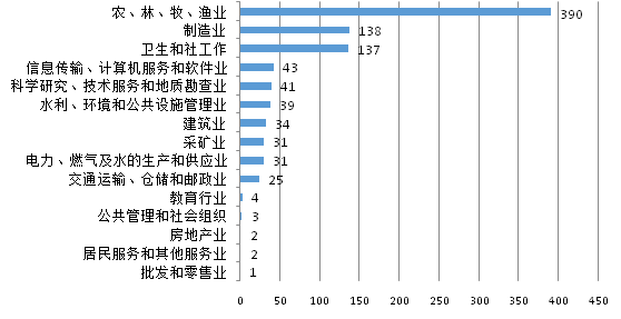 从成果应用的国民经济行业来看,在922项应用技术成果,广泛应用在16个行业中,其中,农林牧渔业、制造业及卫生和社会工作三个行业中科技成果应用的最多,科技成果数量依次为390项、138项和137项,这三个行业的科技成果占应用技术成果总量的72.1%。