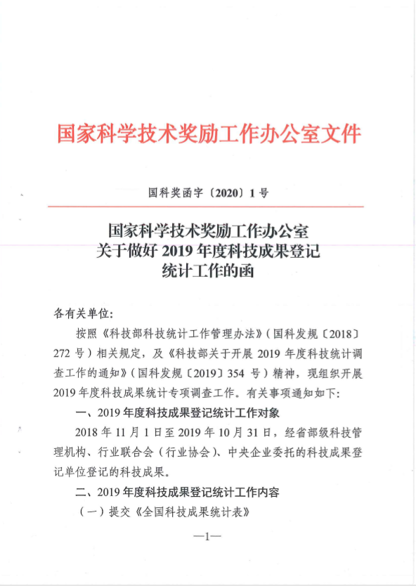 国家科学技术奖励工作办公室关于做好2019年度科技成果登记统计工作的函
