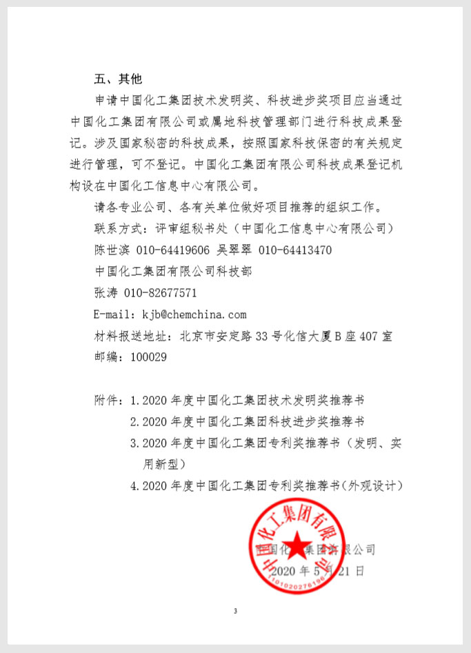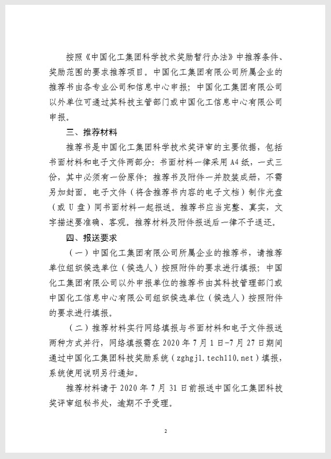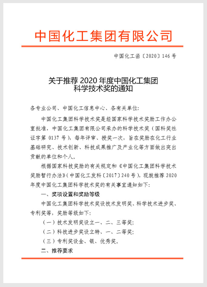 奖励 | 关于推荐2020年度中国化工集团科学技术奖的通知