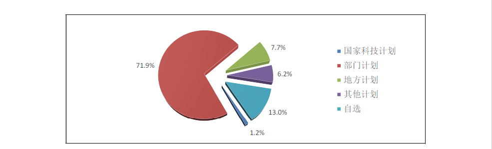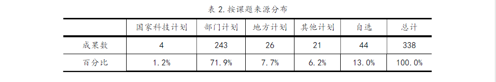 在338项登记成果中,来源于国家科技计划的项目成果占1.2%,部门计划项目成果占71.9%,地方计划项目成果占7.7%,其他计划项目成果占6.2%,自选项目成果占13.0%。鉴于公安部各类科研计划项目及由公安部组织申报的各类国家科研计划项目验收后的成果必须登记,其他成果自愿登记,故部门计划项目成果占主要部分(见表2)。